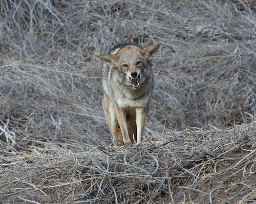 A dominant female coyote had been well hidden on a hillside when two active Vizlu’s began wrestling & nipping each other a couple of hundred feet from where she was resting: they looked as if they could have been fighting. The intense activity — something that bothers coyotes — caused the coyote to emerge on the hilltop with a strong warning display. I call it a “halloween cat display” because that is what it looks like: arched back, fur on end, teeth showing with lips pulled back, scratching the ground. Coyotes do not like hyperactivity — it is important to keep our dogs calm when around coyotes. The coyote’s display is meant to make the dogs take note and leave. The dog’s didn’t take note, but their owner did when I suggested that it might be wise to restrain her dogs and calm them. She did so immediately AND walked her dogs away, saying to the coyote as she did so “Sorry Babe”. The owner was superb in her reaction: willingly leashing and leaving so as not to upset things. As she left, the coyote calmed down immediately and went back to resting.